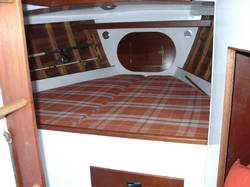 Chain locker in bow followed by large double V-berth cabin. Cabin has a
