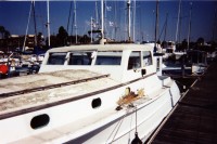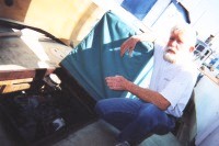 ![]() Here's David again checking out the 3 cyl. Yanmar. The sedan has what appears to be a "planeing" (spelling error?) deserving of another 80 or so horsepower. David is talking about locating a small block V-8 diesel here instead of the Yanmar. |