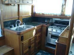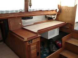 Galley is aft to port. Up three steps to a large comfortable cockpit. Huge
